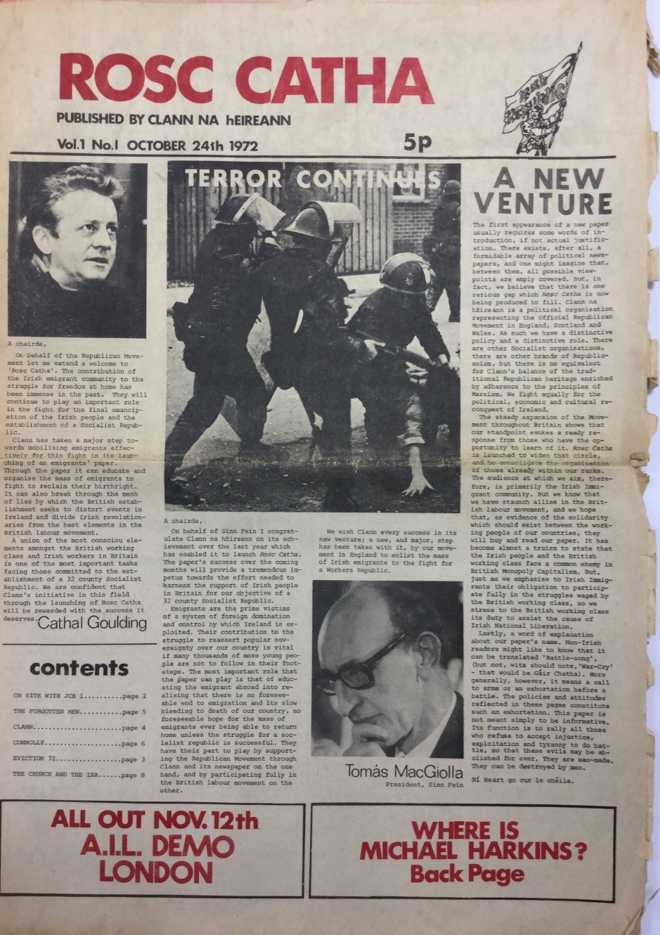 The first edition of Rosc Catha, newspaper of Clann na hÉireann, was published #OnThisDay 24th October 1972.
