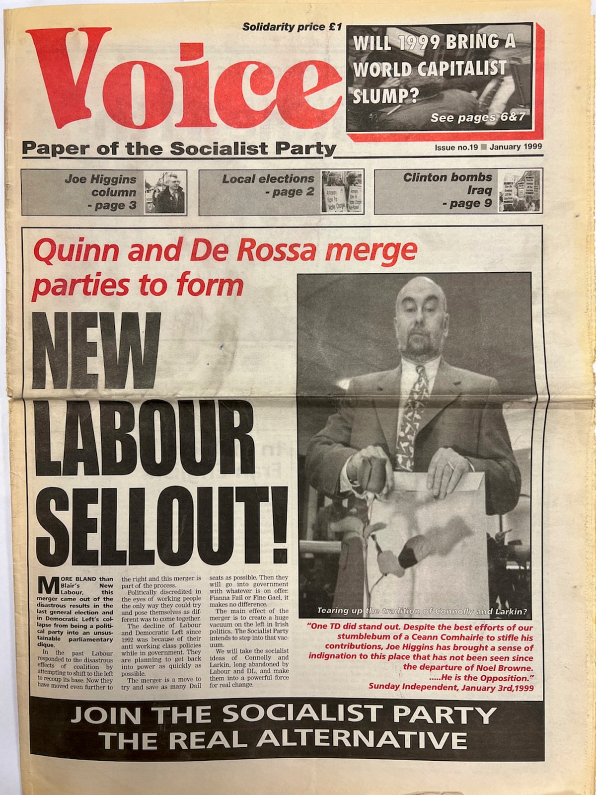 Voice, newspaper of the Socialist Party, on the merger of Democratic Left with the Labour party in 1999.