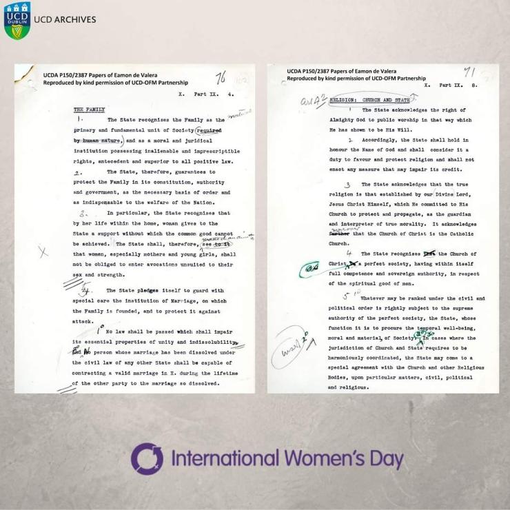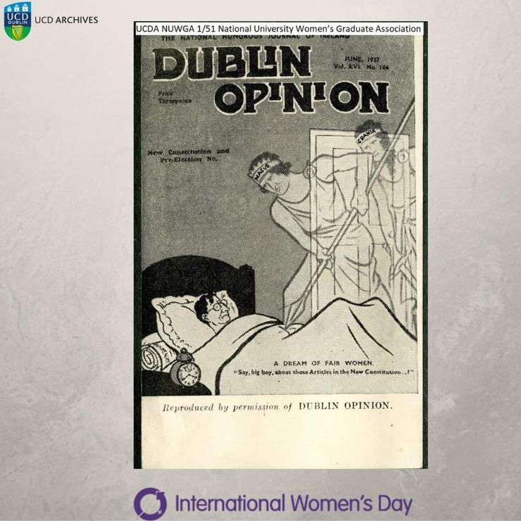 The National Women’s Graduate Association opposed the draft 1937 constitution. The caption on the Dublin Opinion cover image, in one of their files, reads: A DREAM OF FAIR WOMEN: “Say, big boy, about those Articles in the New Constitution…”