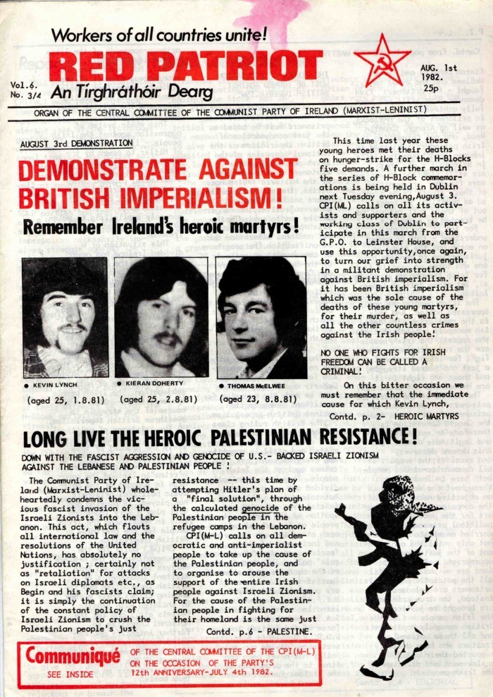 Red Patriot / An Tírghráthóir Dearg, published #OnThisDay, 1st August 1982, by the Communist Party of Ireland (Marxist-Leninist).