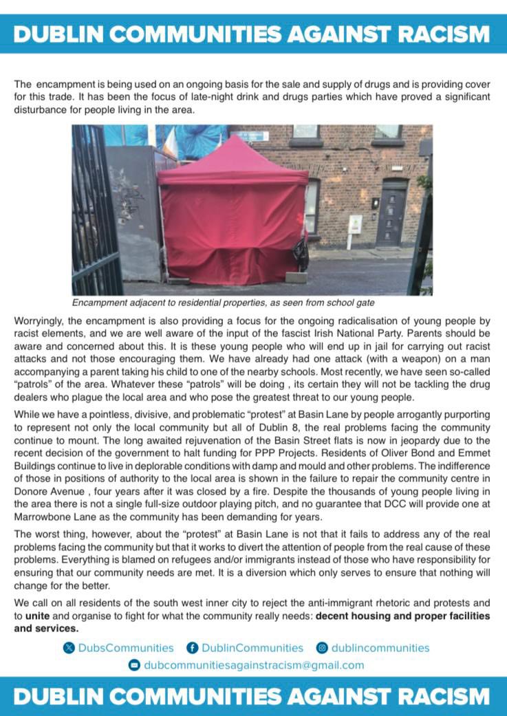 From DCAR: Thousands of leaflets are being distributed across Dublin 8 addressing the Basin Lane ‘protest’, and highlighting the response from GENUINE community activists in the area.