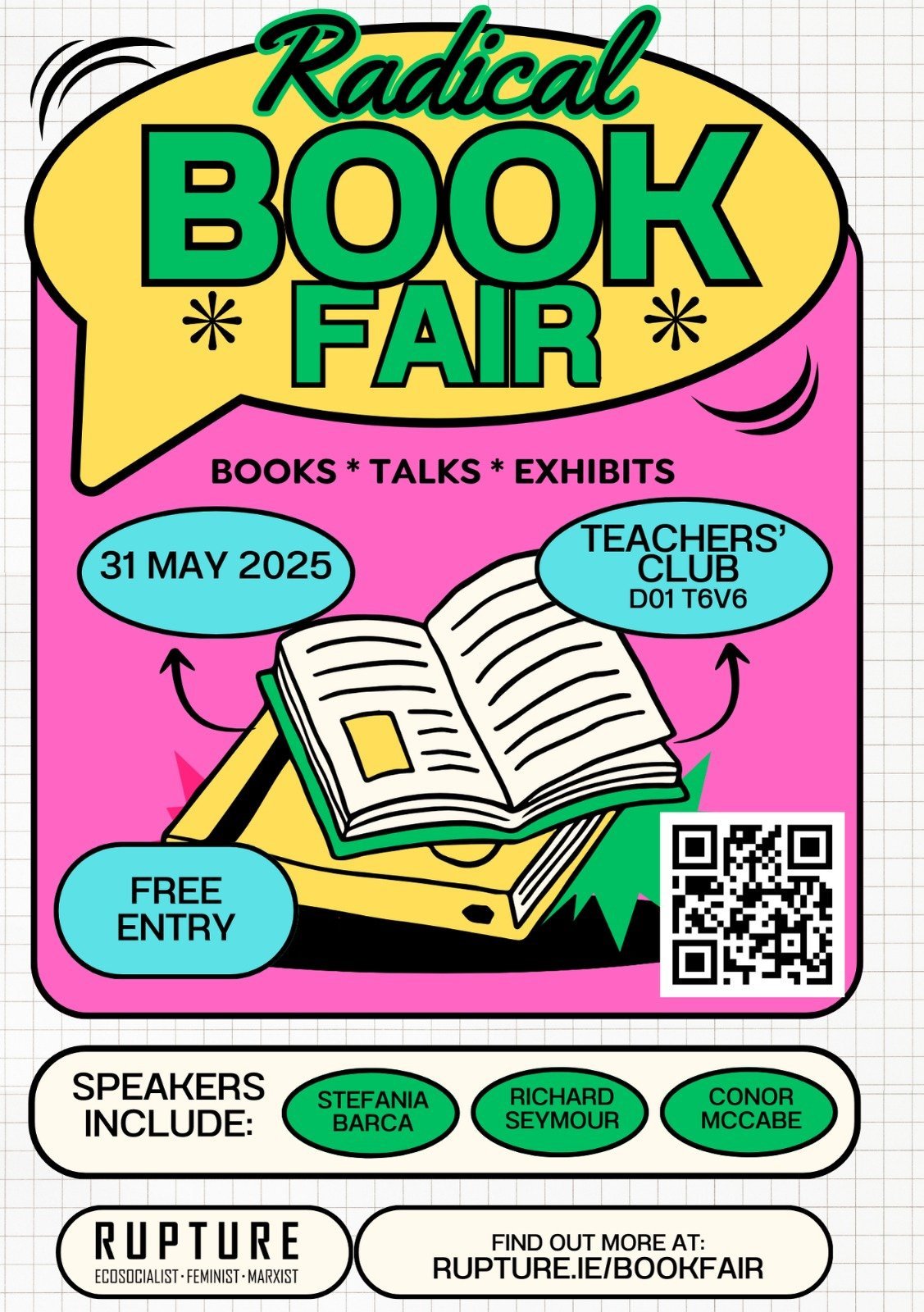 The Rupture Radical Book Fair returns, and quite a few familiar faces there. Radical Book Fair 2025 Saturday 31 May 2025 12 noon to 5 pm Teachers’ Club, Parnell Square, Dublin Books, zines, exhibitions, poetry, art, campaign groups and workshops all under one tent; the Radical Bookfair promises to be a fun and exciting part of 2025’s cultural and political calendar - don’t miss out!
