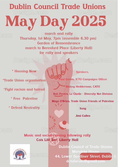 The annual May Day march and rally will take place on May Day, Thursday 1st May 2025, at 7 pm (assembling at 6.30 pm), marching from the Garden of Remembrance, Parnell Square, to Beresford Place (Liberty Hall) for the rally and speeches. The speakers will be Paul Gavan, newly appointed Irish Congress of Trade Unions Advocacy and Campaigns Officer, Aisling Hedderman, Community Action Tenants Union (CATU), Roh…