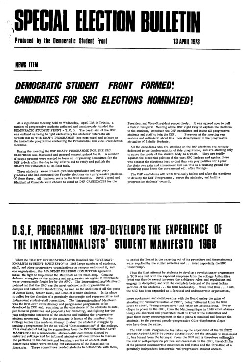 Special Election Bulletin, 13th April 1973 (1973) — Democratic Student Front