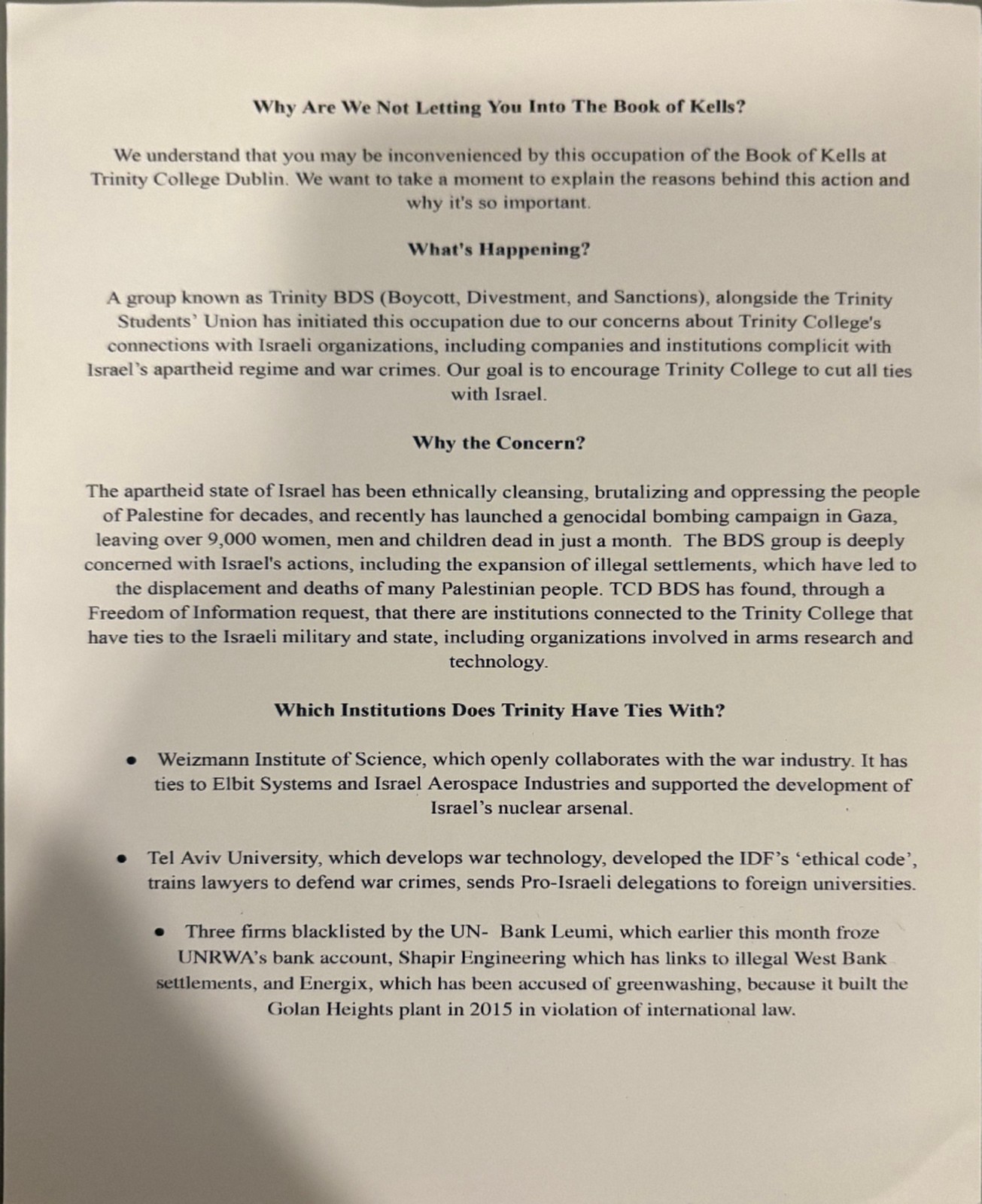 From the Trinity Boycott, Divestment and Sanctions (BDS) campaign to force Trinity College Dublin to divest from Israel, 2024.