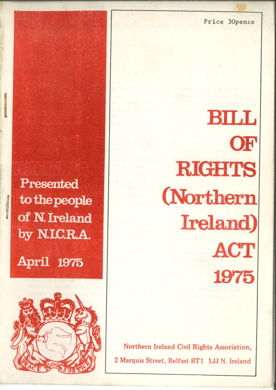 From the Northern Ireland Civil Rights Association in 1975: Bill of Rights (Northern Ireland) Act 1975, presented to the people of N. Ireland by N.I.C.R.A.