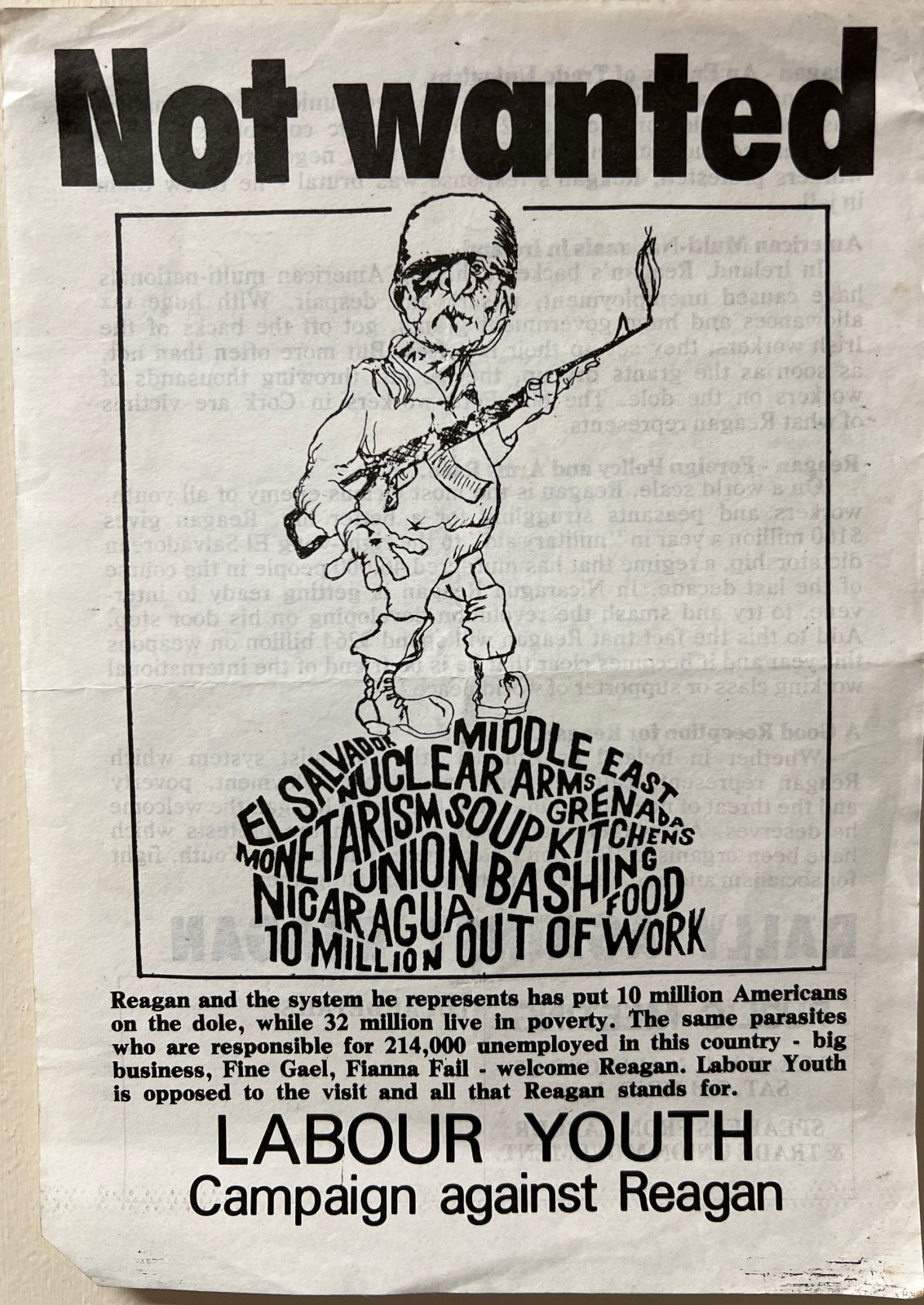 Leaflets issued during Ronald Reagan's visit to Ireland in 1984 by the Reagan Reception Campaign, Irish Campaign Against Reagan's Foreign Policy, and Labour Youth.