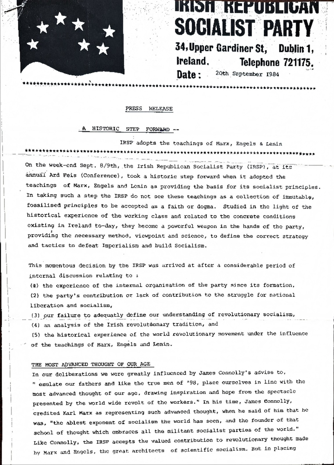 A Historic Step Forward: IRSP Adopts the Teachings of Marx, Engels & Lenin (1984) — Irish Republican Socialist Party