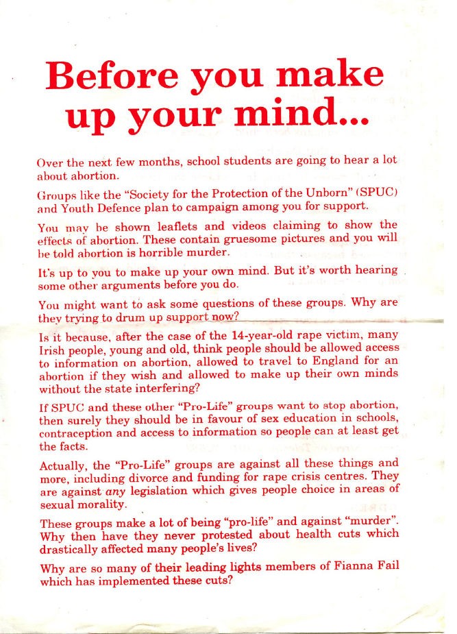 A leaflet from the Socialist Workers' Movement (SWM) during the referendums on access to abortion information and the right to travel, which took place #OnThisDay, 25th of November 1992.