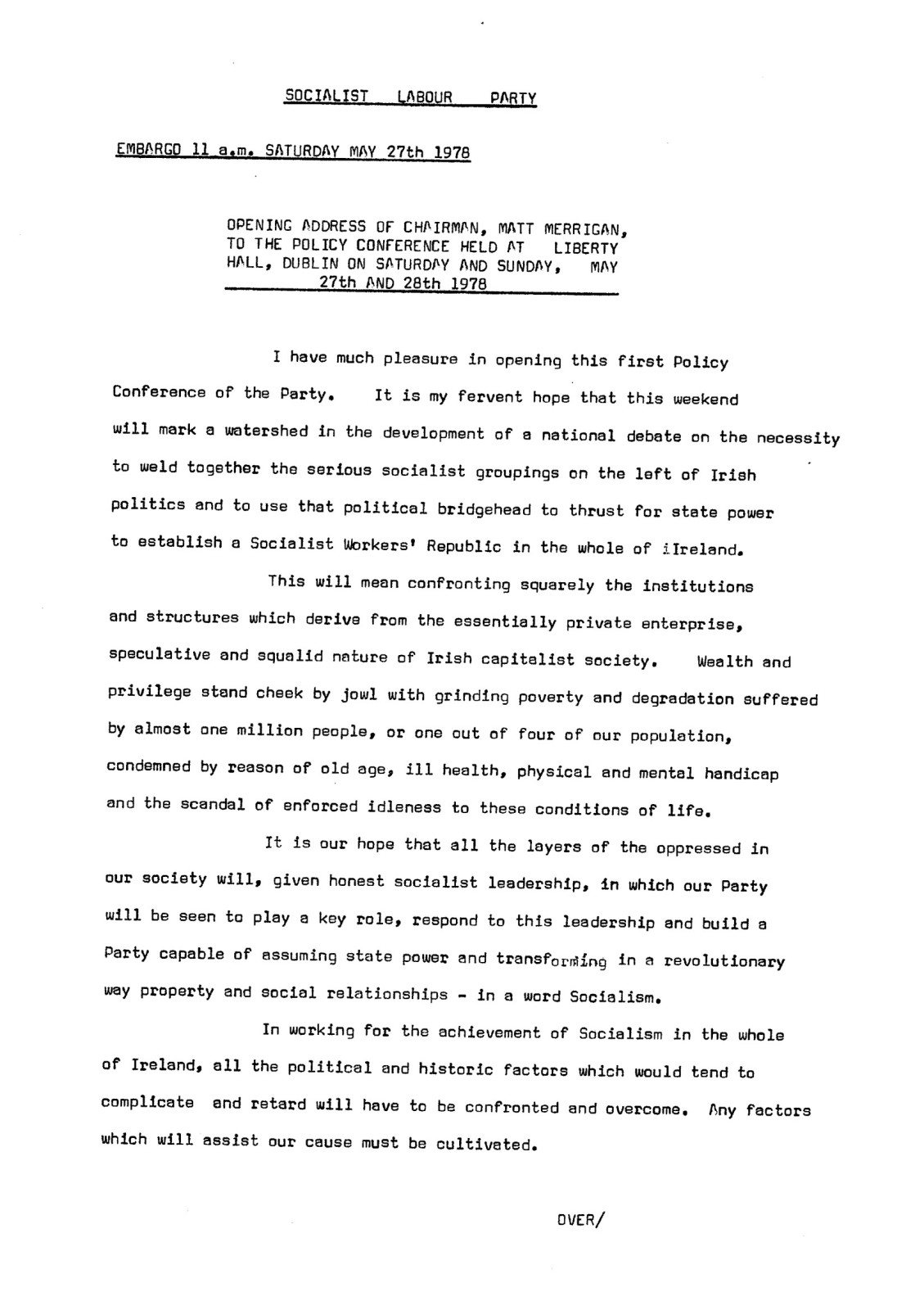 Opening Address of Chairman, Matt Merrigan, To the Policy Conference Held at Liberty Hall, Dublin on Saturday and Sunday, May 27th and 28th 1978 (1978) — Socialist Labour Party