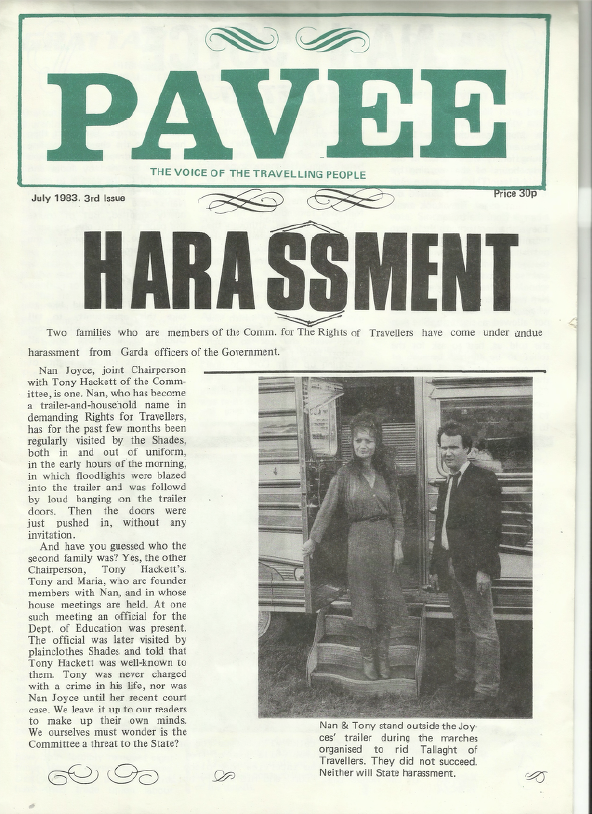 An article on Traveller activism in response to anti-Traveller protests and state mistreatment. The Committee ran the first Traveller candidate for the Dáil, Nan Joyce, in 1982.