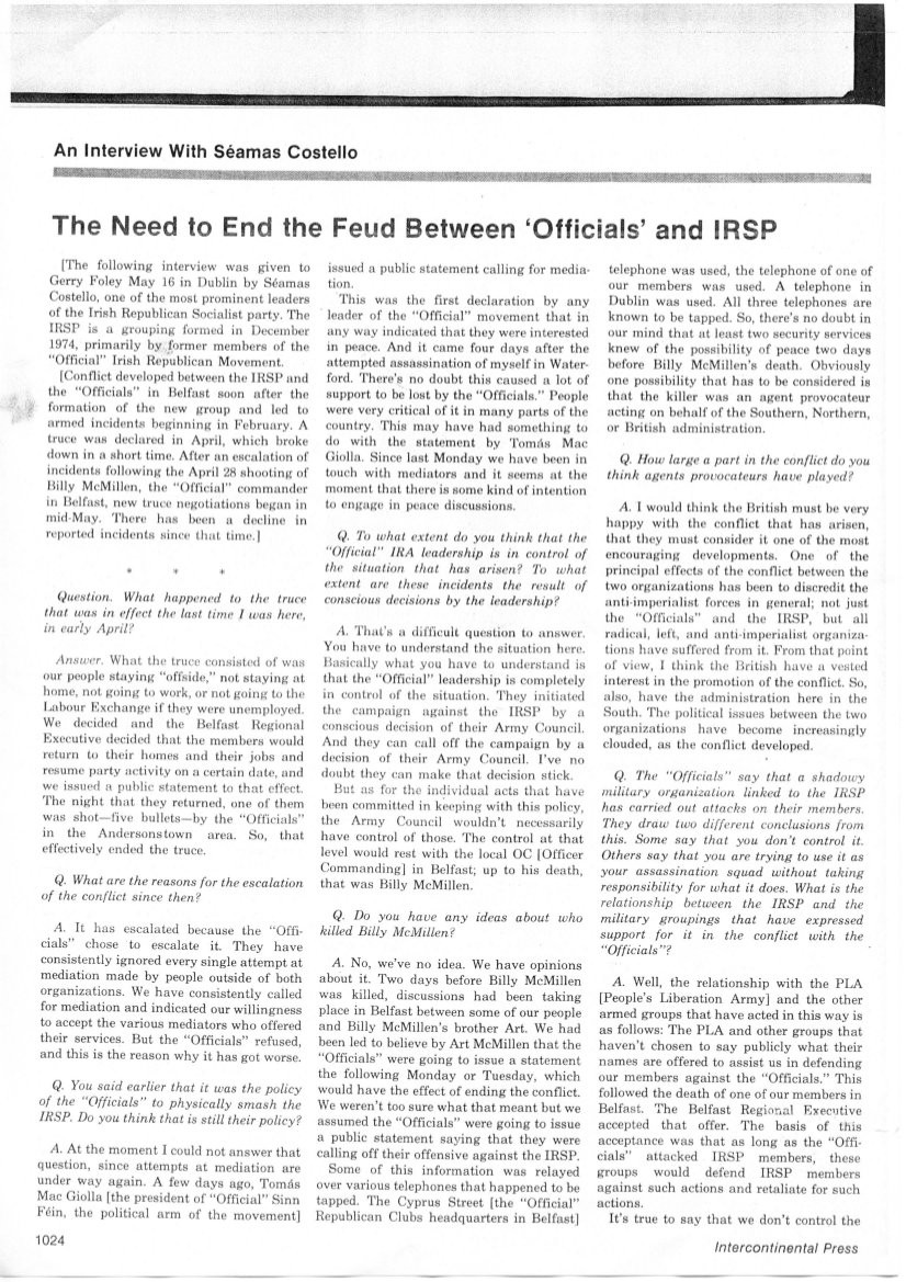"The Need to End the Feud Between 'Officials' and IRSP", An Interview with Seamus Costello.