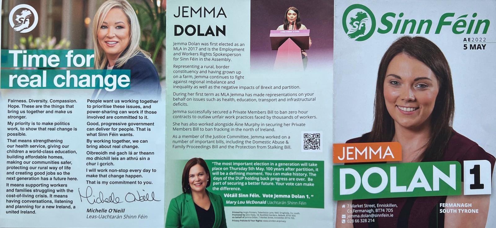 Election leaflet and sample ballot from the 2022 Northern Ireland Assembly elections, for Jemma Dolan of Sinn Féin, running in Fermanagh / South Tyrone.