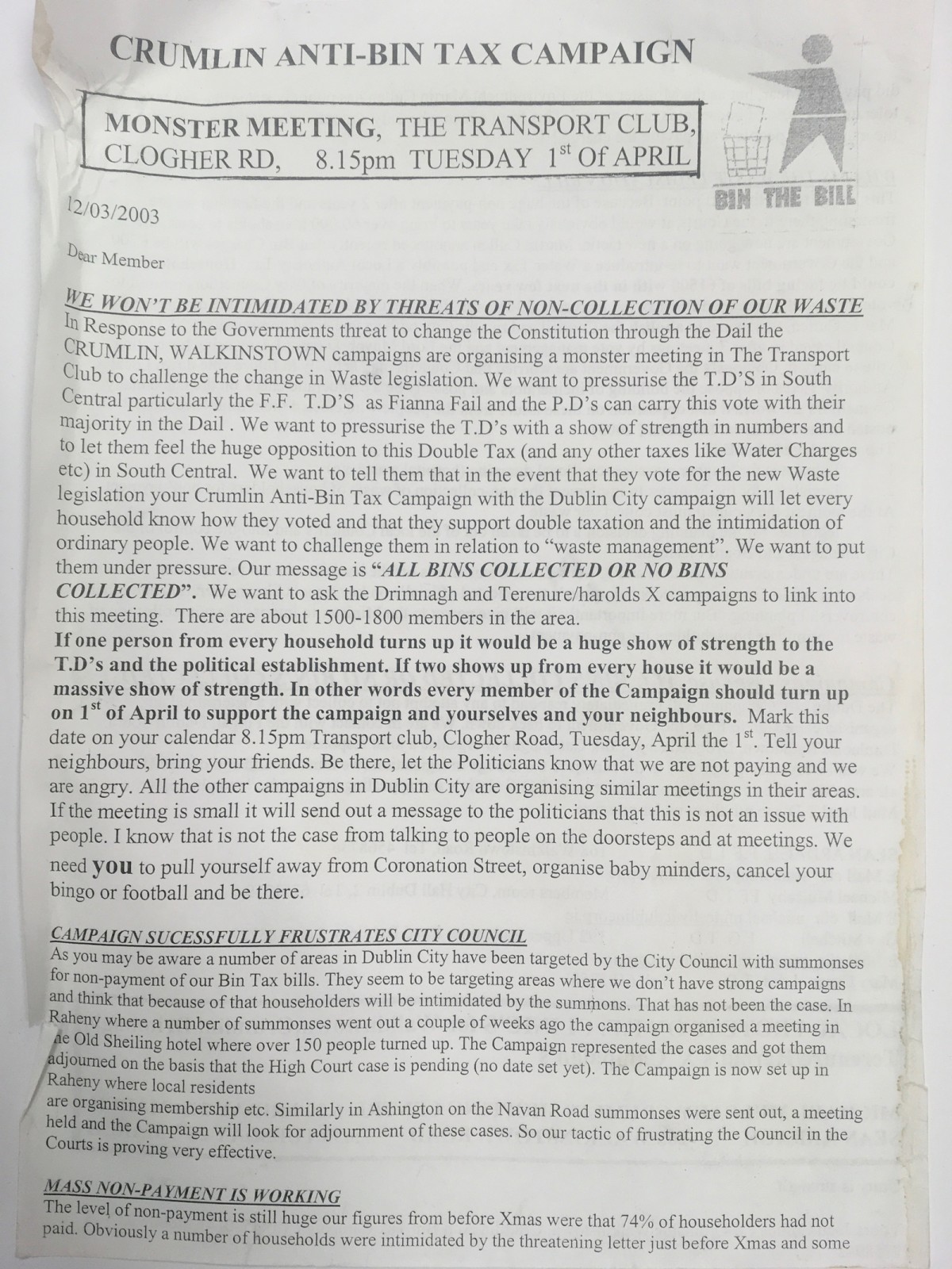 #OnThisDay 12th March 2003, a letter from Joan Collins of the Crumlin Anti-Bin Tax Campaign.