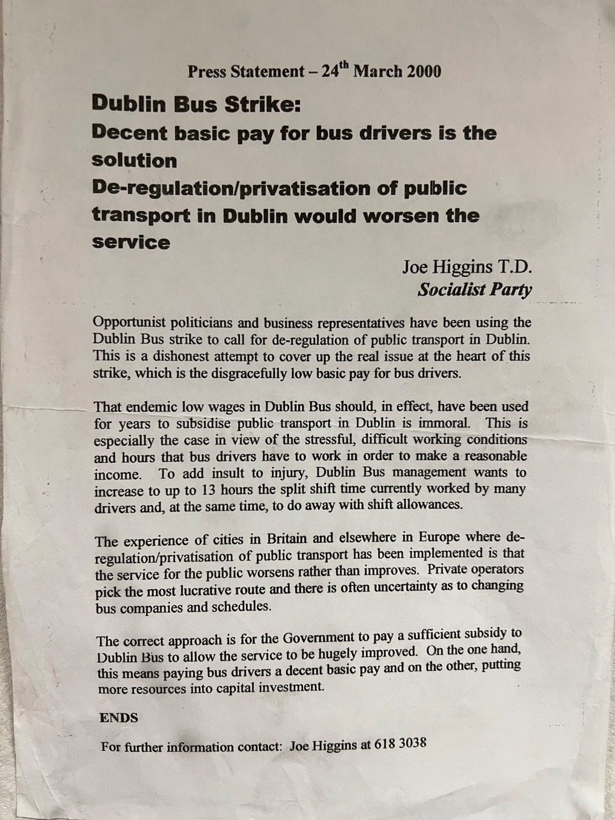 A press statement from Socialist Party TD, Joe Higgins, on the then Dublin Bus strike.