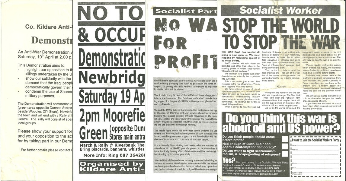 Documents distributed by County Kildare Anti-War Group, Socialist Party and Socialist Workers' Party are collected here as part of the #SnapshotsOfPoliticalAction project: https://www.leftarchive.ie/demonstration/6108/