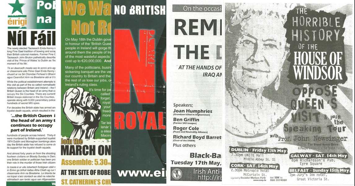 Leaflets distributed by campaigns opposing the State Visit of the British Queen to Ireland, from the Irish Anti-War Movement, Socialist Workers' Party and Éirígí: https://www.leftarchive.ie/demonstration/6193/