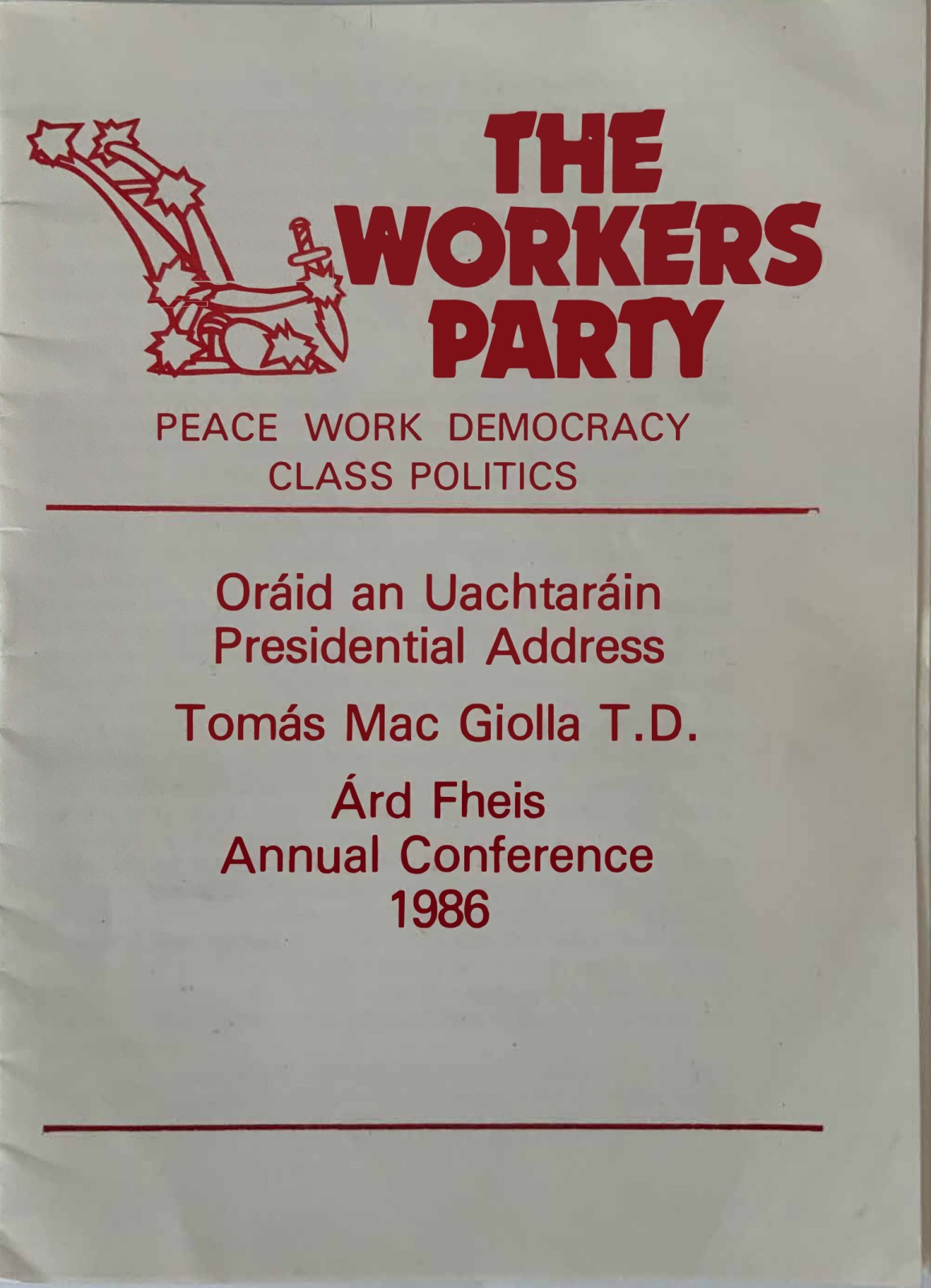 New document: Oráid an Uachtaráin Presidential Address, Tomás Mac Giolla TD, Árd Fheis Annual Conference, 1986, The Workers Party
