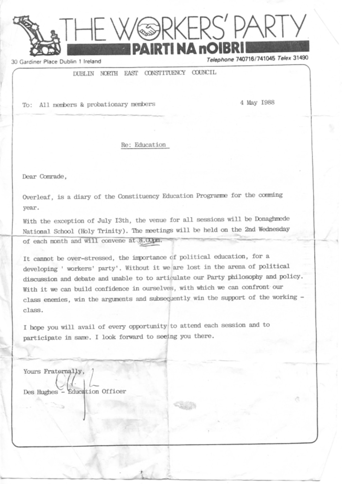 A circular from The Workers' Party on their Constituency Education Programme, 4th May 1988.
