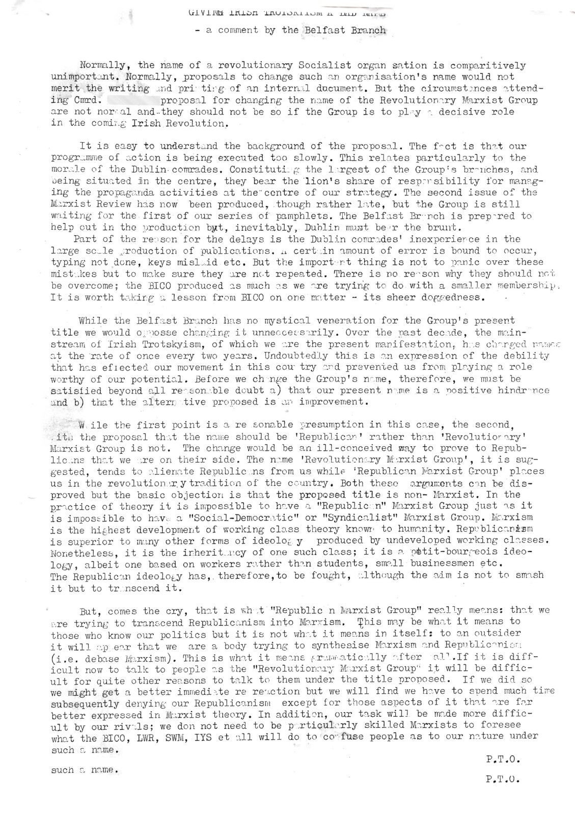 A letter from the Belfast branch of the Revolutionary Marxist Group to the rest of the organisation over a proposal to change the name from ‘Revolutionary’ to ‘Republican Marxist Group’.